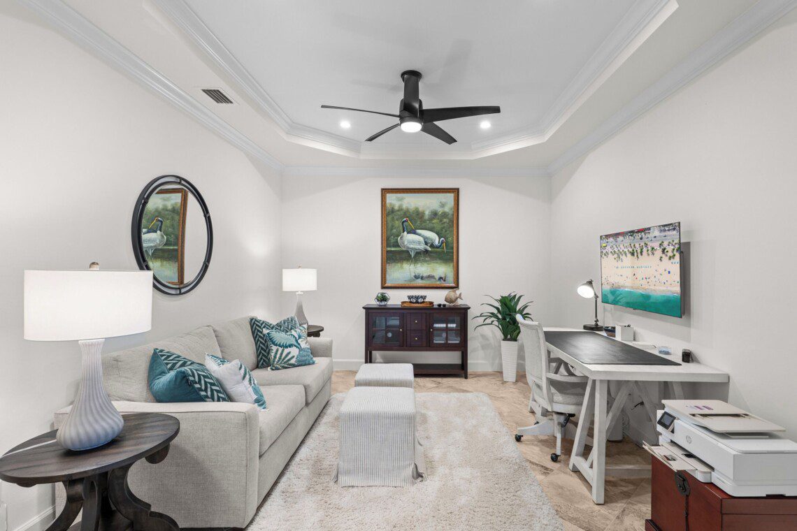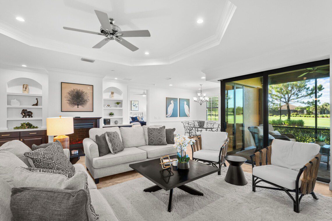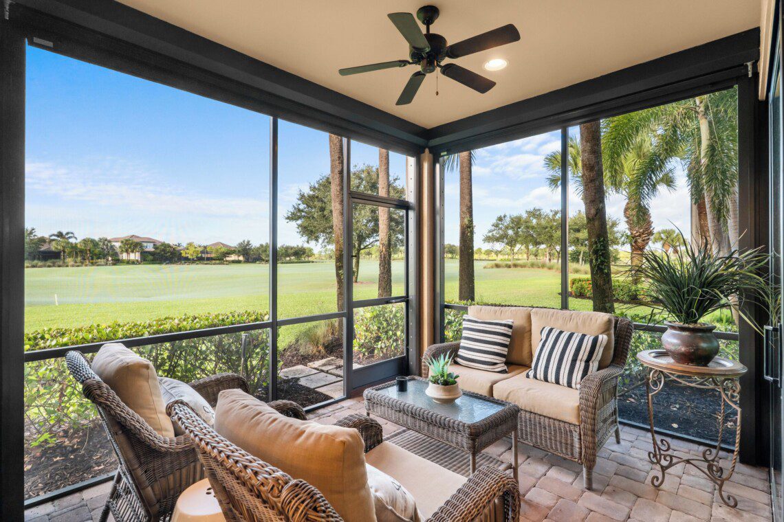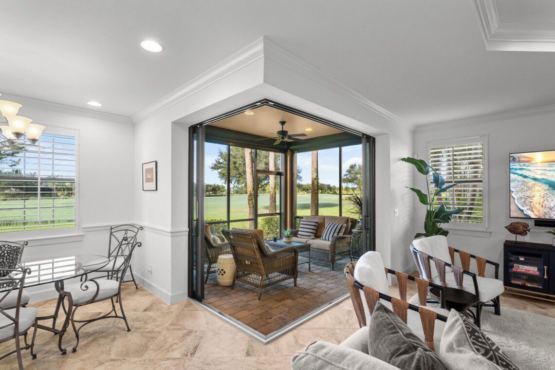 Enjoy the south-facing screened lanai with views of the 7th fairway. Perfect for morning coffee, remote work, or evening wine. Comfortable seating, sunshades, and gentle breezes make this the favorite spot in the home.